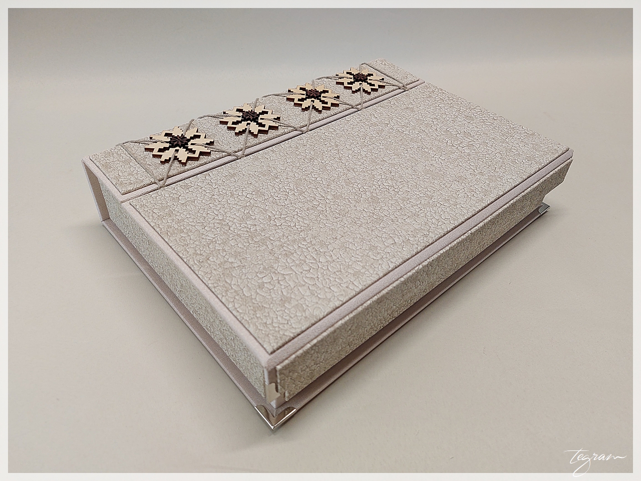 Karp on valmistatud 3mm köitepapist ja kaetud beeži kangast meenutava kattematerjaliga. Karbil on magnetkinnitus.