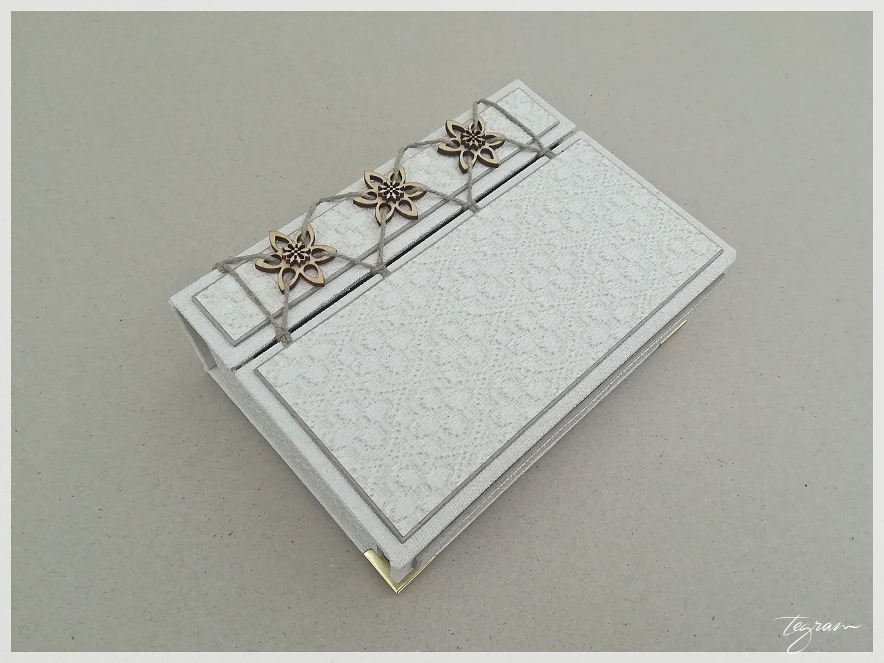 Fotokarp on valmistatud 3mm köitepapist ja kaetud valge, kangast meenutava kattematerjaliga. Karbil on magnetkinnitus.