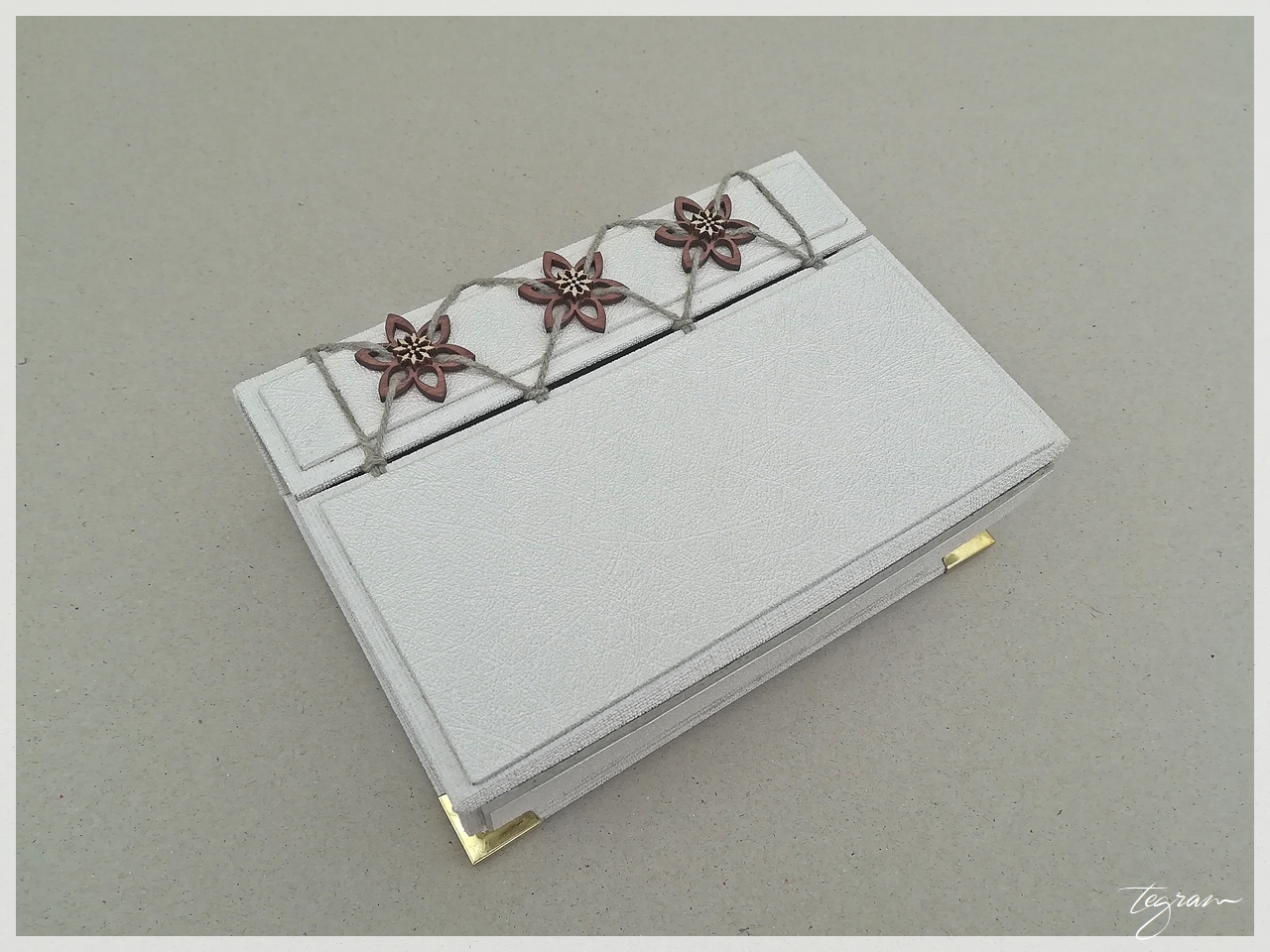 Fotokarp on valmistatud 3mm köitepapist ja kaetud valge, kangast meenutava kattematerjaliga. Karbil on magnetkinnitus.