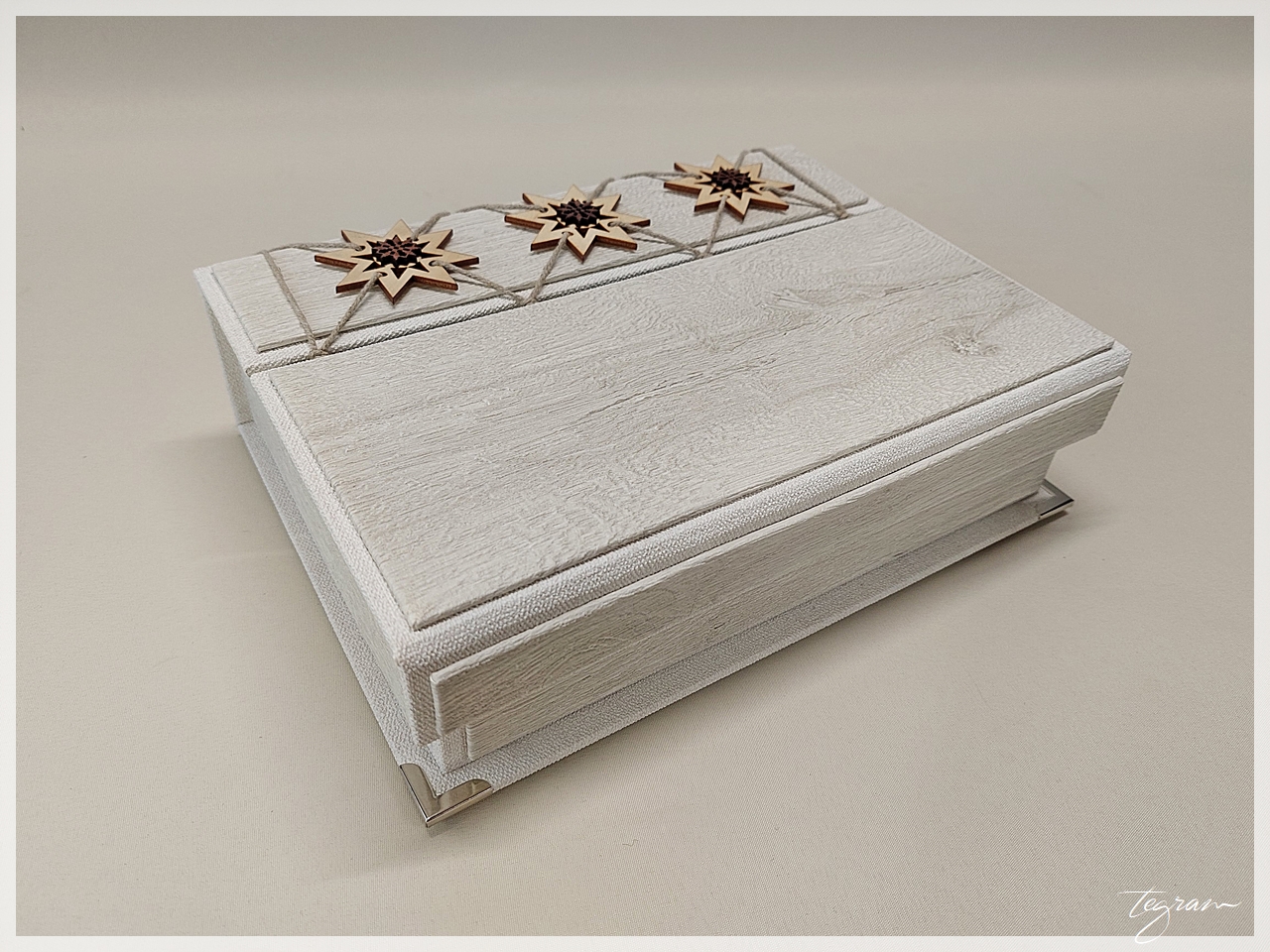 Karp on valmistatud 3mm köitepapist ja kaetud hallikas-valge, puidumustrit meenutava kattematerjaliga. Karbil on magnetkinnitus.
