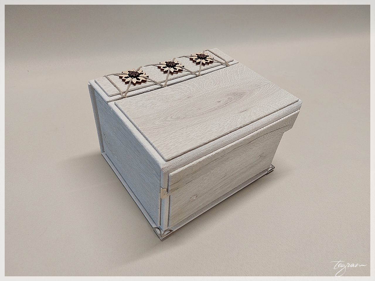 Fotokarp on valmistatud 3mm köitepapist ja kaetud valge kangast meenutava kattematerjaliga. Karbil on magnetkinnitus.
