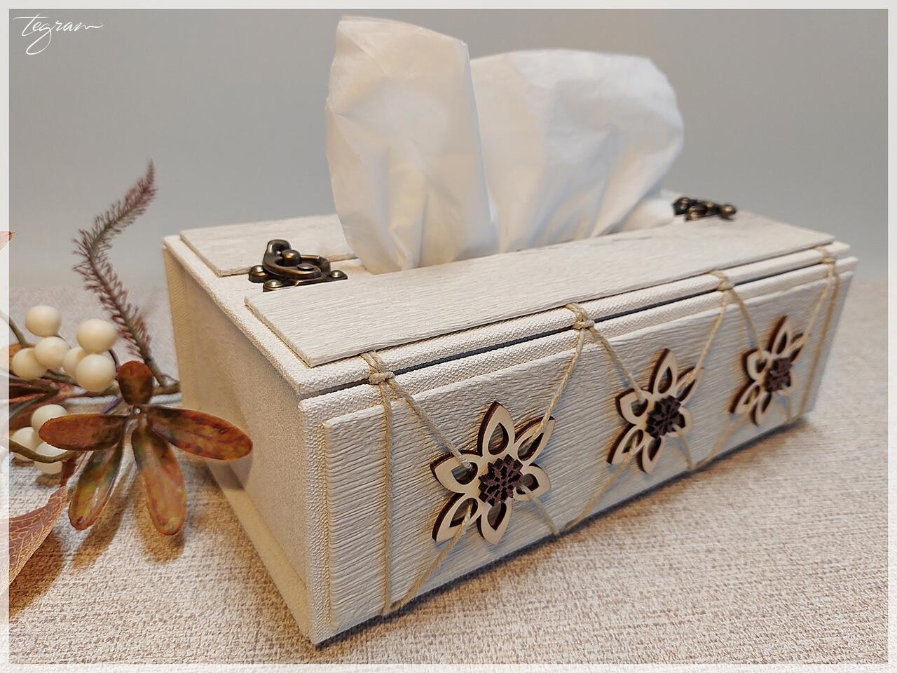 Salvrätikarp on valmistatud 3mm köitepapist ja kaetud valge kangast imiteeriva kattega, millele omakorda lisatud hallikasvalged puidumustrilised paneelid. Karpi kaunistab kahepoolne puitmotiividega topeltköide. Karbi ühel küljel näeb heledaid-, teisel küljel tumedaid lillemotiive. Vaatle kumba pidi soovid!